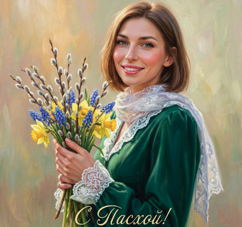 Гиперреалистичная масляная картина на холсте, написанная в стиле изысканного портрета. Женщина с референса ( на 100% сохранить черты лица, цвет глаз, цвет волос), слегка в пол оборота, смотрит прямо в камеру с мягкой, тёплой улыбкой. Композиция — по пояс, с акцентом на свет, кружево и текстуру ткани. На женщине изумрудное платье насыщенного глубокого оттенка, с длинными рукавами, кружевными манжетами и кружевным воротничком. Кружево тонкое, белоснежное, детализированное, красиво выделяется на фоне платья. На голове — белый кружевной платок, лёгкий и полупрозрачный, освещённый мягким дневным светом. Макияж нежный и аккуратный: лёгкий румянец, розовые губы с лёгким блеском, чёрные выразительные ресницы. Всё выполнено в светлой, естественной палитре. В руках — весенний букет из пушистых веточек вербы, мускари и ярких жёлтых нарциссов. Фон пастельный, размытый, с теплыми золотыми и кремово-зелёными оттенками, будто ранний весенний свет пробивается сквозь утренний воздух. Масляная текстура видна, мягкие мазки создают живописную фактуру. В нижней части картины каллиграфическая надпись: С Пасхой!.