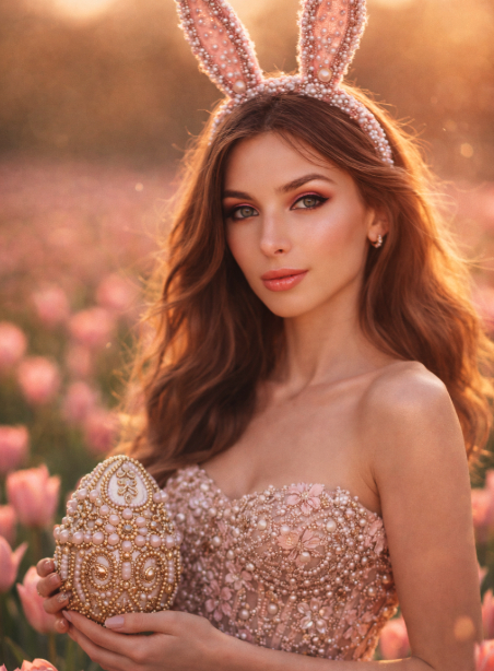Фотореалистичный fashion‑портрет в стиле вог, vertical 9:16, девушка с референсной фотографии модно позирует в поле розовых тюльпанов, кадр по пояс/по грудь, лёгкий разворот корпуса, взгляд в камеру. Безупречный вечерний макияж, хайлайтер, естественное сияние кожи. Волосы обьемные длинные волнистые и рассыпчатые, по контуру виднеется свечение от заходящего солнца. На голове роскошный ободок с высокими розовыми кроличьими ушами, декор бисером и жемчугом. Haute couture платье/корсет, полностью расшитый жемчугом, кристаллами и цветочными аппликациями в розово‑золотой гамме, сияющая фактура. В руках большое декоративное пасхальное яйцо, расписанное золотыми узорами и жемчужными элементами. Мягкий свет, золотой час, журнальная модная съемка , пастельная цветокоррекция, dreamy mood, shallow depth of field, нежное боке, высокая детализация тканей и украшений, editorial fashion, ultra realistic. Canon EOS R5, 85 mm,