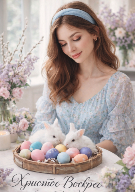 Создай нежный весенний пасхальный портрет молодой женщины в светлом интерьере, наполненном цветами. Девушка с мягкими каштановыми волосами сидит за круглым столом в воздушном голубом платье с мелким цветочным принтом и голубой повязкой на голове. Она смотрит вниз с легкой улыбкой, создавая спокойное и мечтательное настроение. На столе — деревянный лоток с яркими окрашенными пасхальными яйцами и белыми пушистыми кроликами. Вокруг много нежных сиреневых, розовых и лиловых цветов, стеклянные и керамические вазы, веточки вербы, мягкий дневной свет из большого окна. Атмосфера романтичная, уютная, весенняя, воздушная и очень эстетичная. Стиль — fine art portrait, pastel tones, soft natural light, photorealistic, highly detailed, elegant editorial, dreamy composition, 4k. Добавь элегантную каллиграфическую надпись на русском языке: «Христос Воскрес».