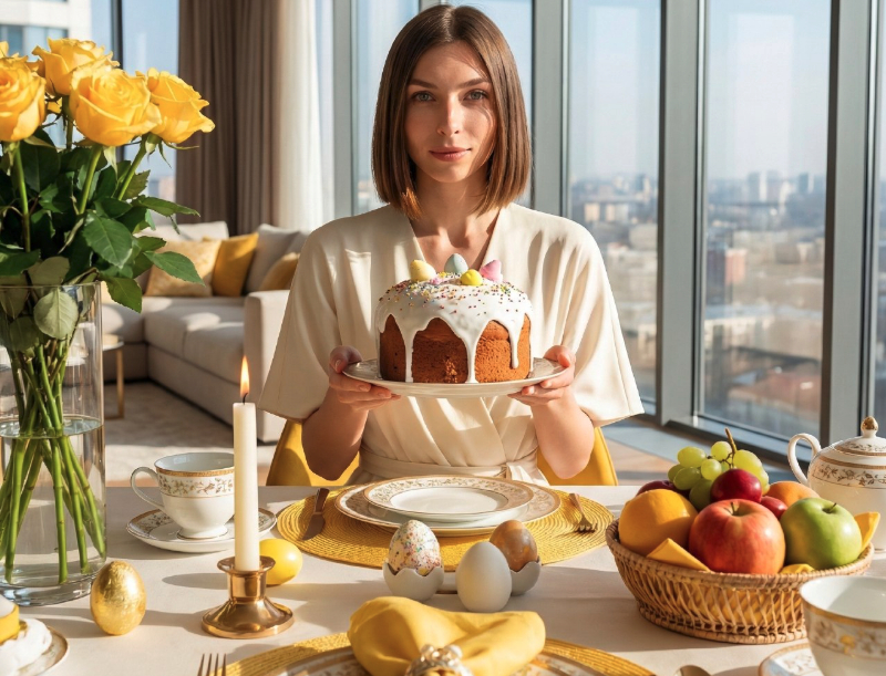 Создай элегантный пасхальный портрет молодой женщины в современном светлом интерьере с панорамными окнами. Девушка с гладким каре в кремово-белом платье сидит у празднично сервированного стола и держит на тарелке большой кулич с белой глазурью и декором. На столе — желтые и золотистые акценты, свеча, красивая посуда, корзина с фруктами и декоративными яйцами. Рядом стоит роскошный букет желтых роз в стеклянной вазе. Атмосфера стильная, солнечная, дорогая и праздничная. Стиль — luxury lifestyle, elegant editorial photography, soft daylight, refined composition, photorealistic, highly detailed, 4k.