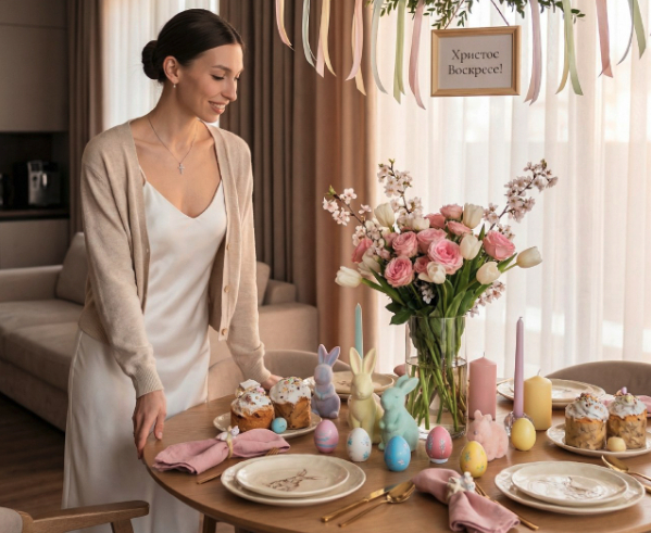 Создай красивую пасхальную сцену с молодой женщиной у праздничного стола в современном интерьере. Девушка с аккуратно собранными волосами улыбается, стоя рядом с круглым столом, сервированным к Пасхе. На ней белое атласное платье на тонких бретелях и светлый кардиган, на шее крестик. Стол украшен изысканной посудой с изображением кроликов, золотыми приборами, розовыми салфетками, декоративными кроликами, пастельными пасхальными яйцами, свечами и праздничными сладостями. В центре — высокий букет розовых и белых цветов. Атмосфера уютная, стильная, женственная и праздничная. Стиль — elegant home Easter decor, editorial photography, soft warm light, photorealistic, highly detailed, 4k. Сверхе надпись на русском языке: Христос Воскрес!