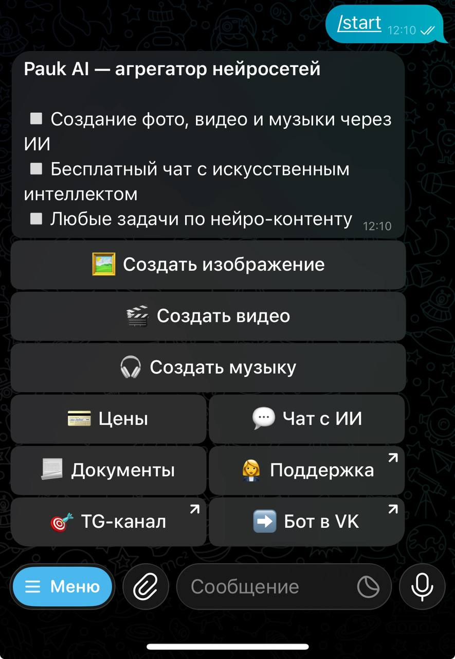 Сначала откройте бот Pauk AI в Telegram или в ВК. После запуска появится основное меню, через которое можно перейти к созданию изображений, видео и других материалов.