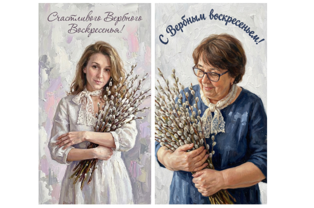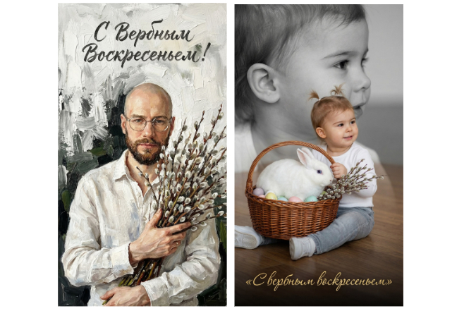 Плюс в том, что ИИ открытки не ограничиваются стандартным набором: веточки вербы, золотые рамки, одинаковые надписи и один и тот же фон. Через нейросеть можно: