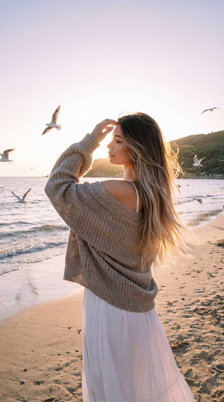 Используй лицо с моей референс-фотографии (face reference), сохрани узнаваемость на 100% : не меняй овал лица , форму носа , форму бровей, губы, цвет глаз, длину волос и цвет волос . Девушка на берегу моря на закате, чуть боковой ракурс и вид сзади, воздушно развевающиеся длинные волосы, белое лёгкое платье и объемный вязаный кардиган спущенный с одного плеча, она поднимает руку к лицу, закрывая глаза от солнца; вокруг летают чайки, и несколько в небе, лёгкие волны накатывают на песчаный пляж, на заднем плане зелёный прибрежный холм; композиция по правилу третей, девушка смещена вправо, ведущие линии волн и стаи птиц; тёплый золотой час, сильная контровая засветка с мягким солнечным флэром за головой, тонкая кайма света по силуэту, мягкие тени, мечтательное ностальгическое настроение;натуральная лайфстайл-фотография, пастельные тёплые тона, лёгкая плёночная зернистость, низкая точка съёмки, слегка мягкий градиент неба. Фотография снята как при движении