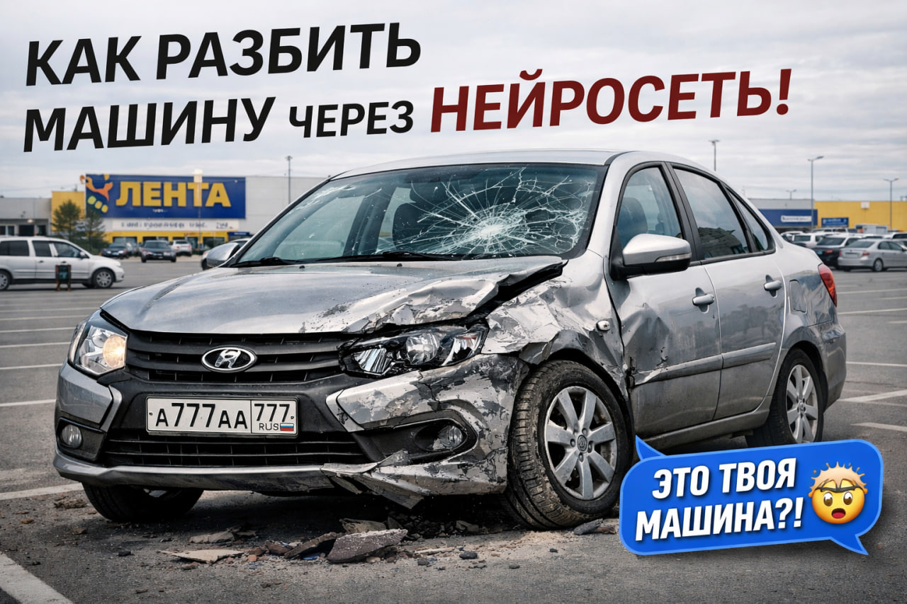 реалистичная сцена, автомобиль из исходного фото попадает в лёгкое ДТП, аккуратные повреждения кузова (вмятины, царапины), треснувшее стекло, сохранить автомобиль полностью узнаваемым, сохранить государственные номера без изменений, сохранить локацию и окружение как на оригинальном фото, тот же ракурс и освещение, сфотографировано на айфон 17 про, высокая детализация, реалистичное освещение, без сильных разрушений, без огня и взрывов, 4K, 16:9