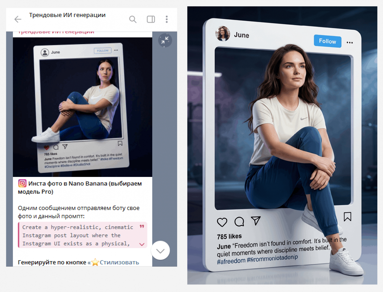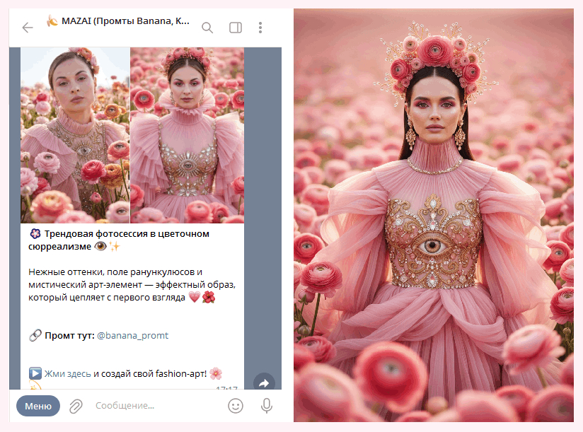 В канале проекта выходят кейсы, примеры генераций и готовые промпты, которые удобно использовать как основу для фотосессий: