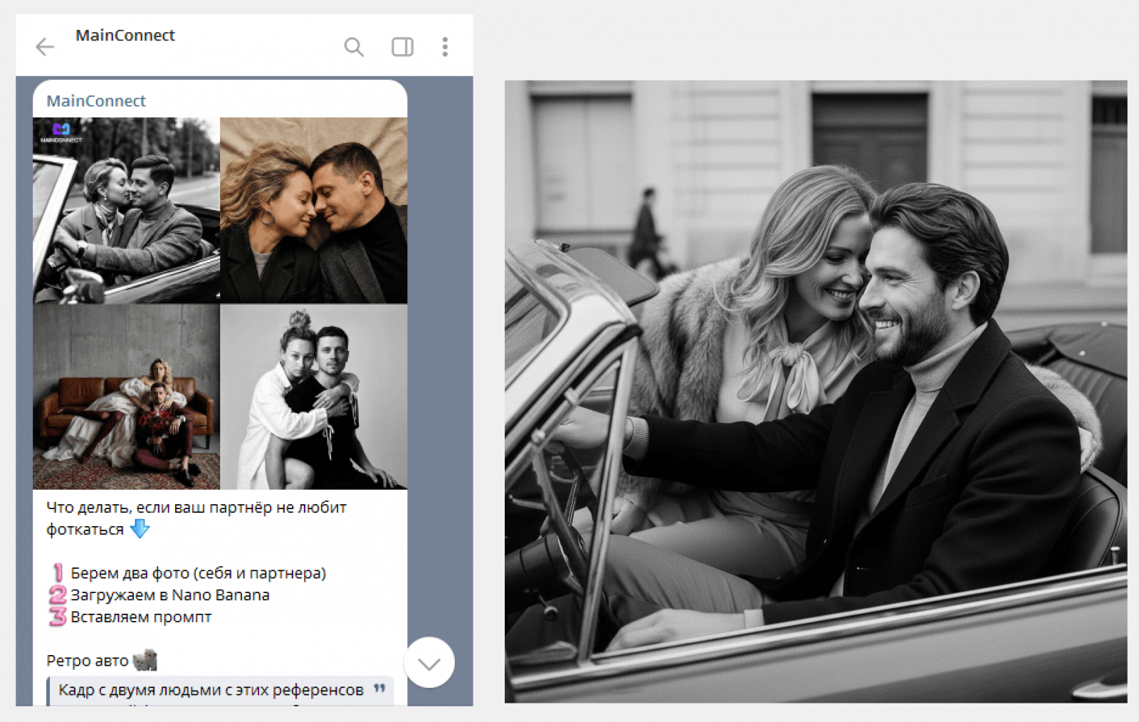 Подборки в Telegram особенно удобны для ИИ-фотосессий: в них уже есть идеи поз, образов и визуальных стилей, которые легко перенести в любой бот с поддержкой Nano Banana. Такой формат экономит время, упрощает процесс и помогает быстрее находить интересные решения.