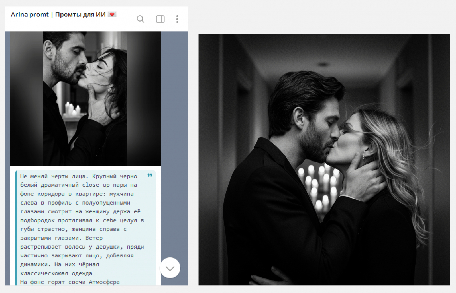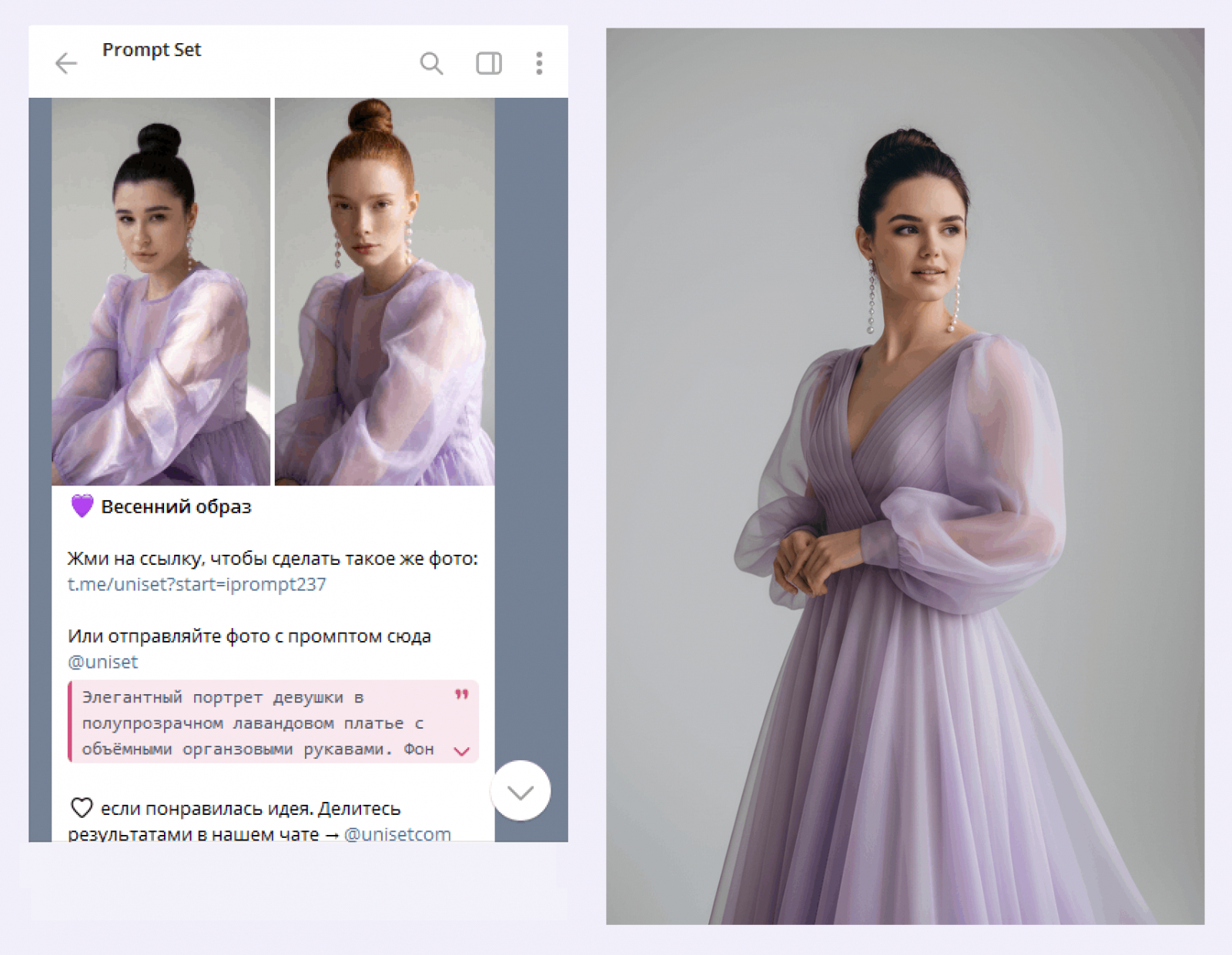 Отдельный канал регулярно пополняется идеями и готовыми запросами для создания фотосессий и визуальных сцен: