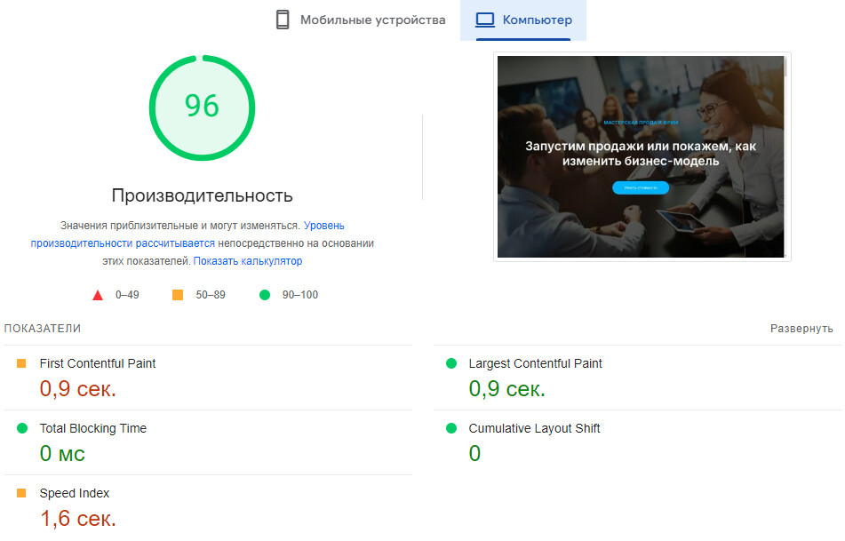 Благодаря этому сайты стабильно получают 90+ баллов в Google PageSpeed и попадают в зеленую зону — как на десктопе, так и на мобильных устройствах.
