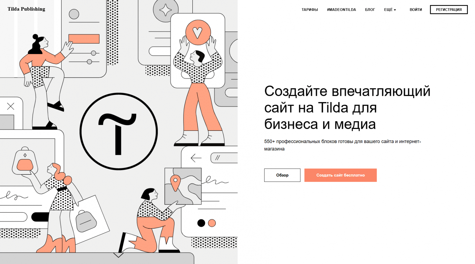 Tilda — один из самых известных конструкторов сайтов в русскоязычной среде. Он позволяет быстро запускать лендинги и промо-сайты благодаря большой библиотеке готовых блоков. Для маркетинговых задач и тестирования гипотез это действительно удобный вариант.