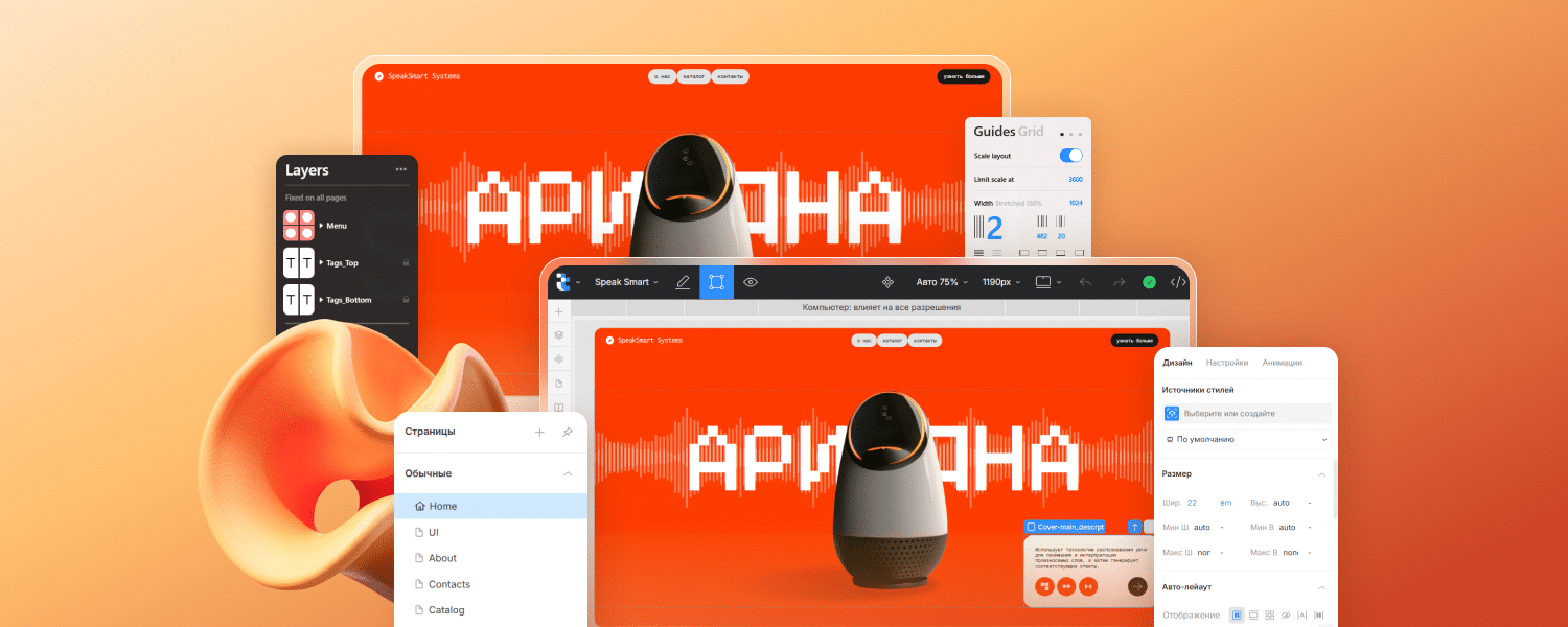 Страницы строятся на автолейаутах с управлением структурой, размерами и поведением элементов. Это позволяет достаточно точно переносить даже сложные проекты, делать гибкую адаптивность для разных экранов и не упираться в ограничения шаблонов.