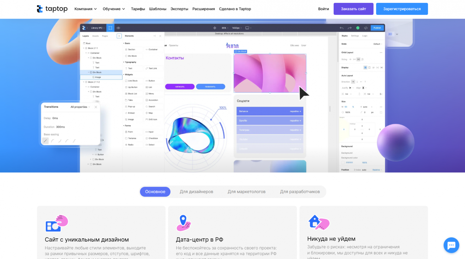 Платформа поддерживает основные принципы профессиональной верстки и позволяет создавать сайты любой сложности без кода.