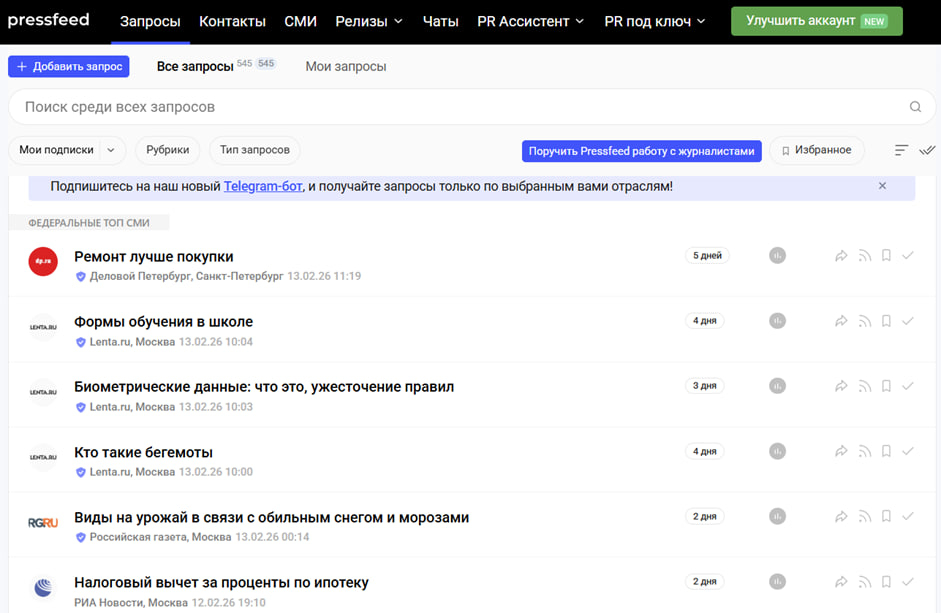 Pressfeed — это сервис журналистских запросов, где СМИ сами ищут экспертов. Механика простая: журналист публикует тему, вы даете качественную фактуру, если материал подходит, то попадаете в публикацию бесплатно.