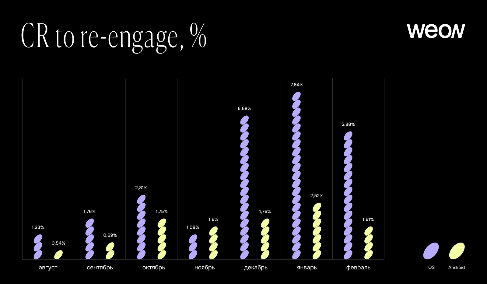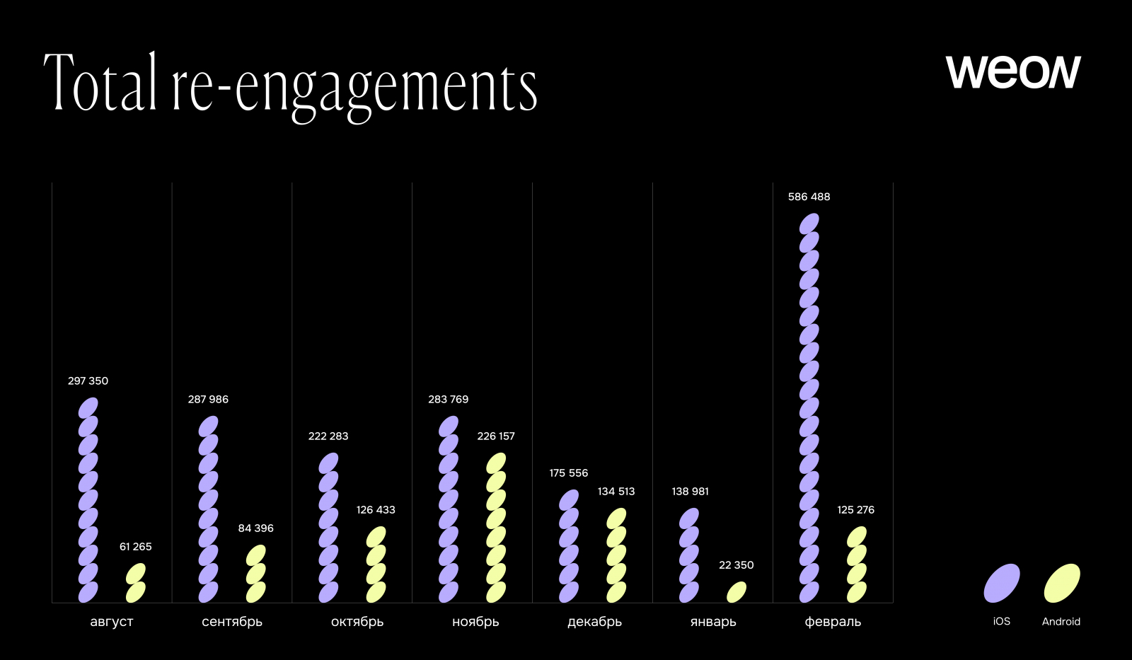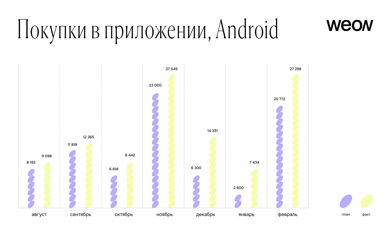 iOS: После первоначального отставания благодаря проведённым оптимизациям показатели значительно улучшились. Возвращенные пользователи совершили 37 899 покупок, среднее выполнение плана за период составило 130%.