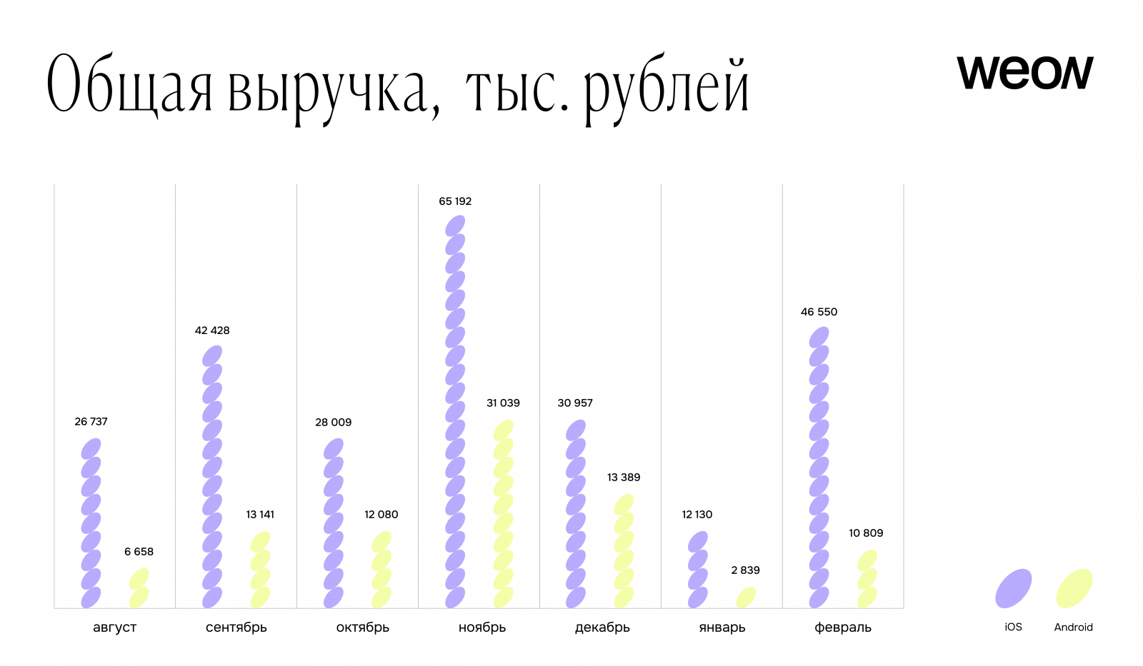 Стоимость привлечения пользователя в покупку (CPA) на протяжении всего периода удерживалась в рамках целевых значений: 90 рублей на iOS и 75 рублей на Android.