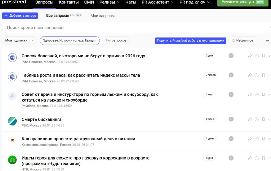 Чтобы не тратить часы на поиск редакций и переговоры, я использовала сервис журналистских запросов Pressfeed. Это площадка, где журналисты публикуют темы будущих материалов и ищут экспертов для комментариев.