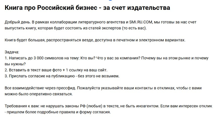 Pressfeed — это площадка, где встречаются журналисты и эксперты. Механика простая и гениальная: журналисты из разных изданий (от отраслевых блогов до РБК, Forbes или «Коммерсанта») публикуют запросы. Эксперт видит запрос, понимает, что тема его, и пишет ответ прямо внутри сервиса. Если ответ качественный, то он попадает в статью бесплатно.