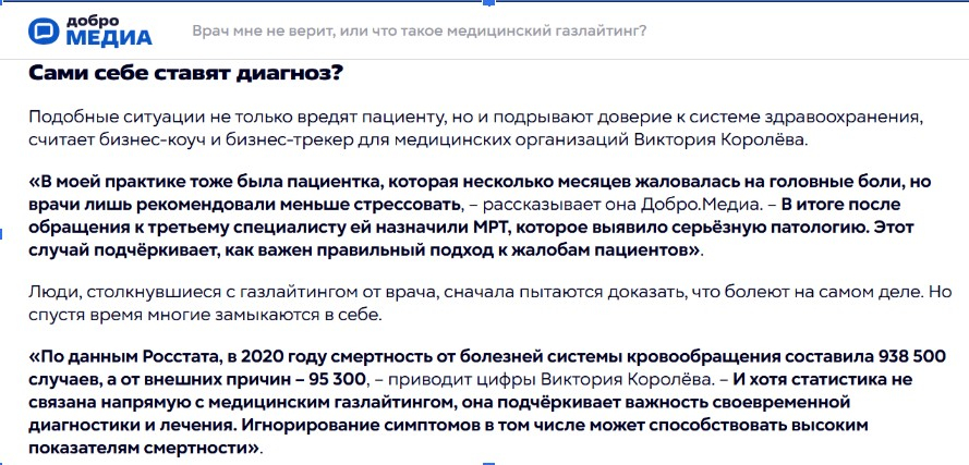 Я сама активно участвую в работе со СМИ и хорошо понимаю, как формируются темы и запросы журналистов. Например, одна из моих экспертных публикаций — материал о медицинском газлайтинге в Добро.Медиа и экспертные комментарии для портала МИР 24: о внедрении нейроинтерфейсов и ИИ и психологии восприятия прошлого.