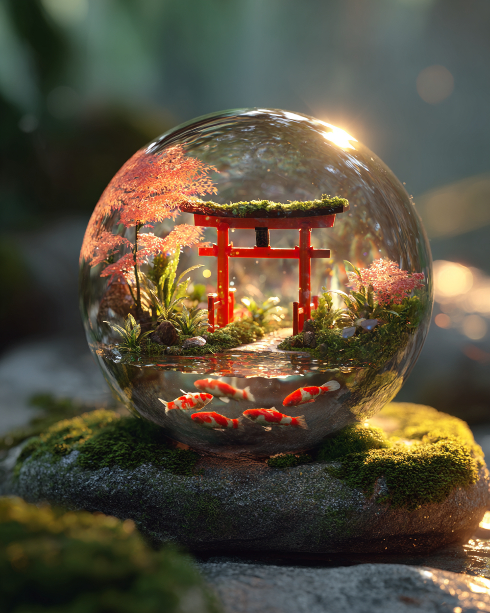 « A cracked glass sphere on a mossy stone table, inside it a miniature Japanese zen garden with a tiny red torii gate, blooming sakura tree with falling petals, a small koi pond reflecting golden light. Volumetric fog leaking through the cracks, dramatic side lighting, macro photography, tilt-shift effect, 8K ultra detailed --ar 4:5 »