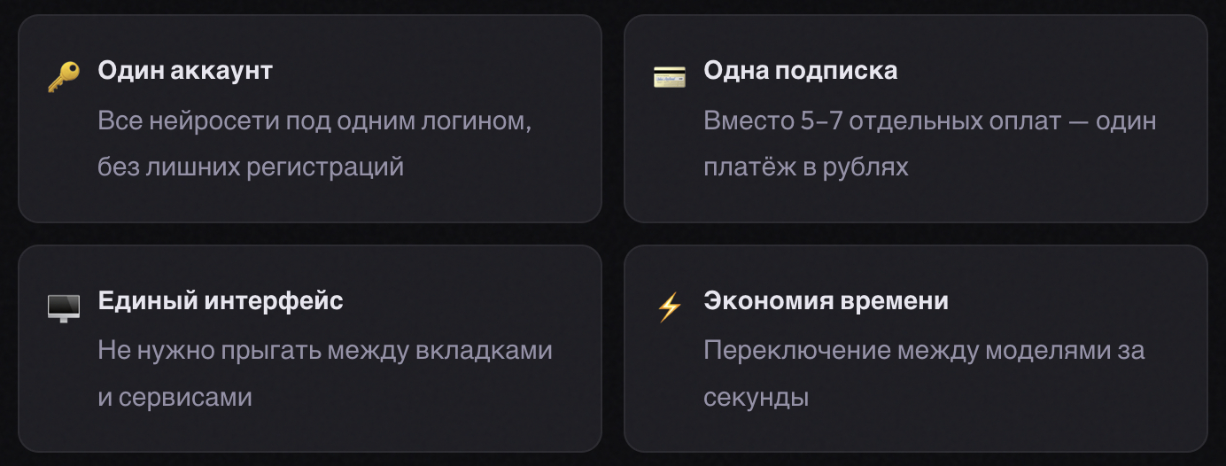 Если коротко — это единая платформа, где собраны больше 100 нейросетей. Один аккаунт, одна подписка, доступ через сайт или через Telegram-бота. Никаких отдельных регистраций.