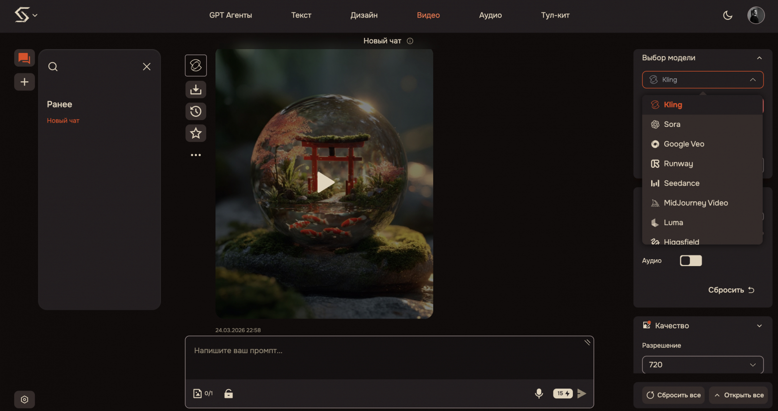 Sora, Runway, Kling — видеогенерация, которая ещё год назад казалась фантастикой. Можно создавать ролики из текстового описания или анимировать статичные изображения. Для соцсетей — это практически бесконечный конвейер контента: reels, shorts, промо-ролики.