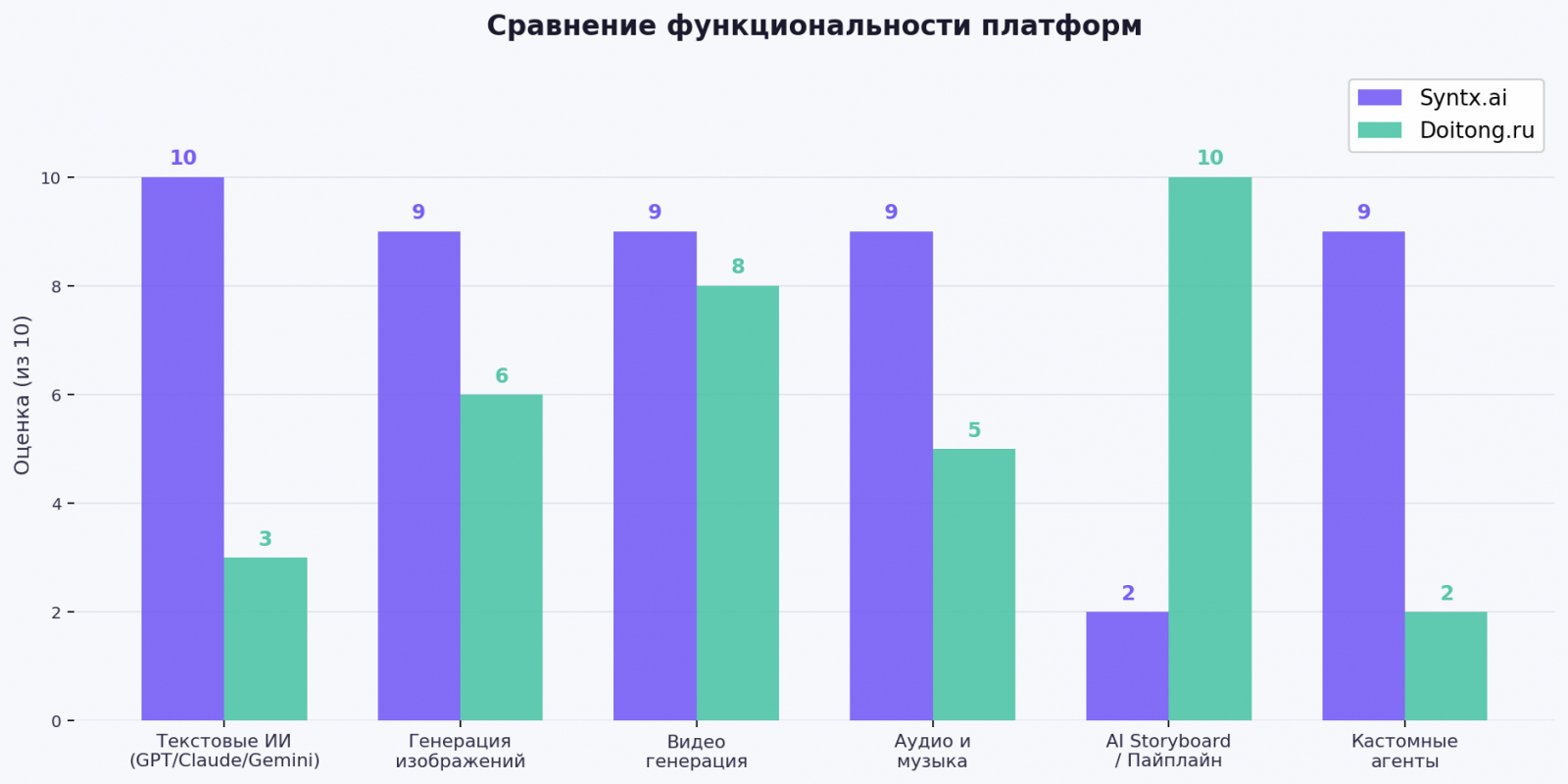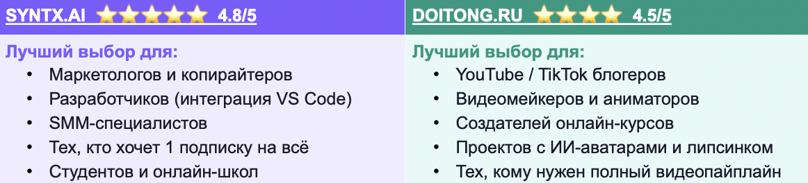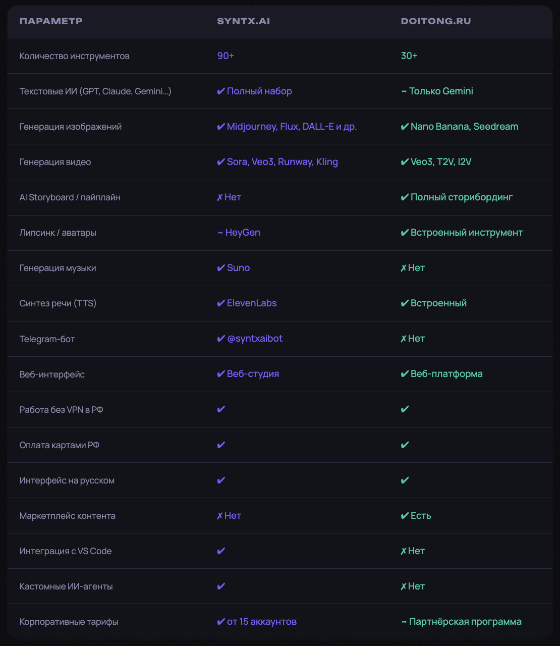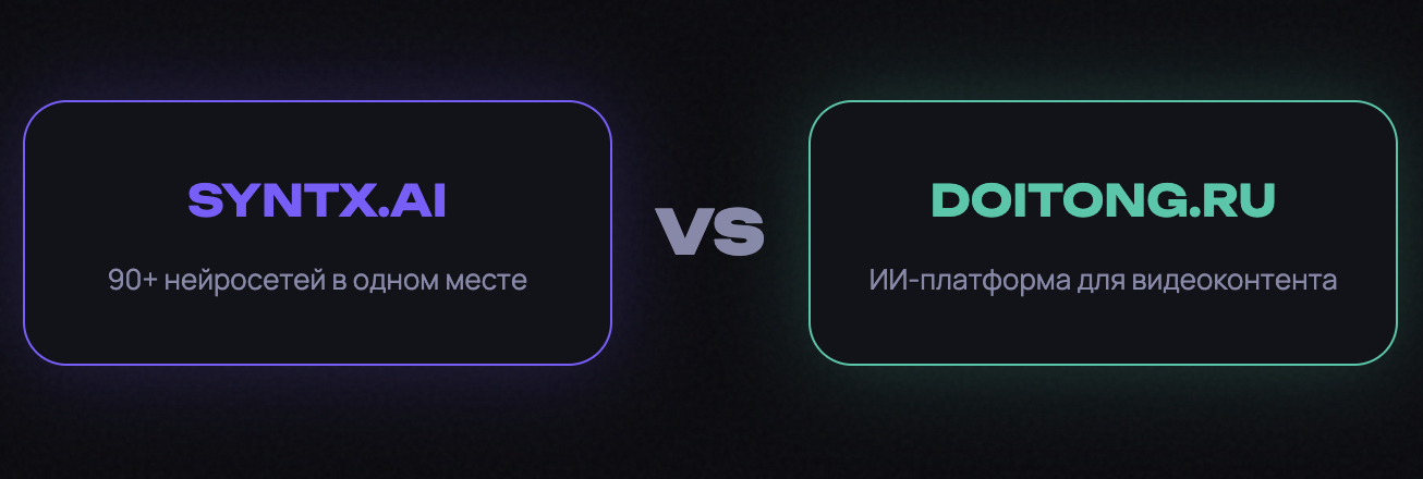 Идеальная связка: Syntx.ai — для текстов, изображений, музыки и LLM-задач. Doitong.ru — для создания видео с полным пайплайном и аватарами. Многие профессионалы используют оба сервиса одновременно.
