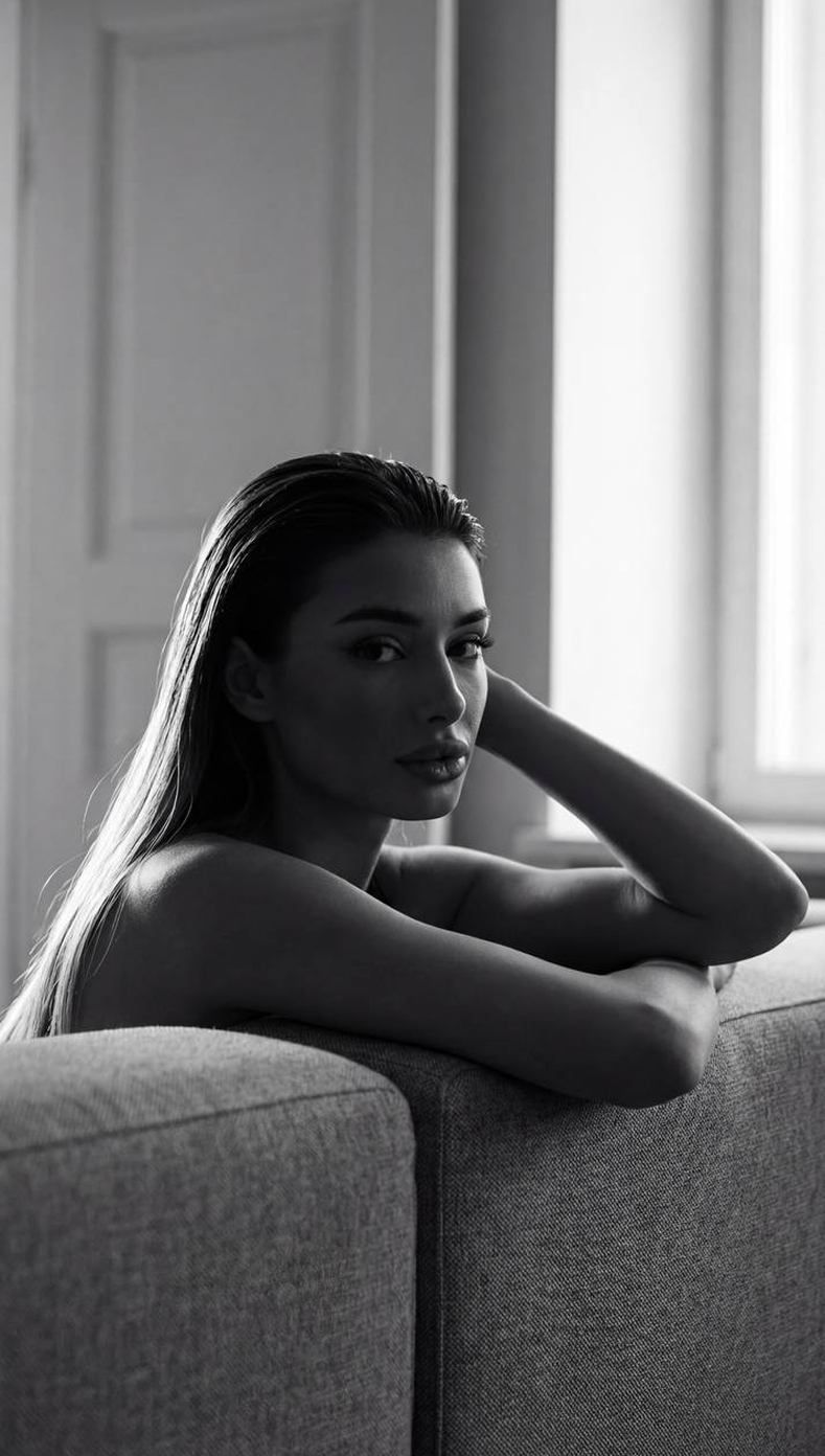 Используй лицо с моей референс-фотографии (face reference), сохрани узнаваемость на 100% : не меняй овал лица , форму носа , форму бровей, губы, цвет глаз, длину волос и цвет волос .Черно-белая студийная фотография: интимный портрет девушки в полуобороте, она опирается локтем на спинку дивана, правая рука за головой, лицо частично скрыто тень, длинные волосы аккуратно зачесаны назад и подсвечены контровым светом; интерьер: минималистичная комната с мягким естественным боковым светом из окна справа, тонкие архитектурные линии двери на заднем плане. Композиция вертикальная, кадр по правилу третей , фигура смещена влево, большое негативное пространство справа, акцент на текстуре кожи, ткани дивана и бликах на волосах. Свет и настроение: низкий ключ, мягкий рассеянный свет с сильными контрастами и глубокими тенями, меланхоличное, задумчивое и интимное настроение. Стиль: черно‑белая пленочная эстетика с лёгкой зернистостью, кинематографическая обработка, тонкая пастельная градация серого. Параметры камеры: портретный объектив 50 мм, f/1.8, малая глубина резкости, ISO ~800, выдержка 1/125. Формат 9:16