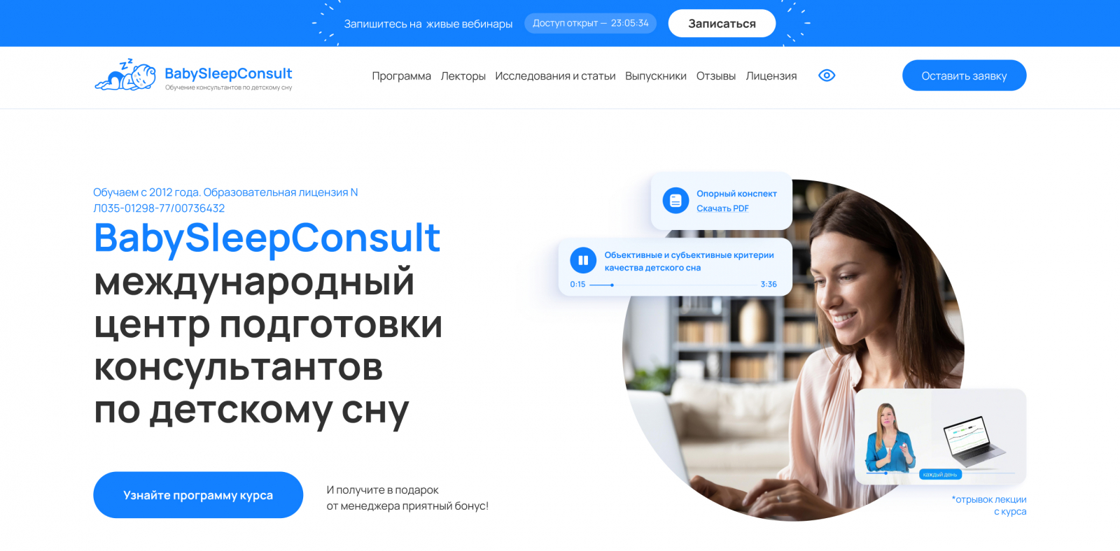 BabySleepConsult — международный центр подготовки консультантов по детскому сну. У ребят была мощнейшая база: обучение на основе доказательной медицины, мягкие методики и студенты по всему миру. Но старый сайт об этом молчал. Медленная загрузка, устаревший визуал и полное отсутствие маркетинговых инструментов. Мы спроектировали платформу с нуля, превратив клиентские идеи в логичный продукт, который сам продает форматы обучения.