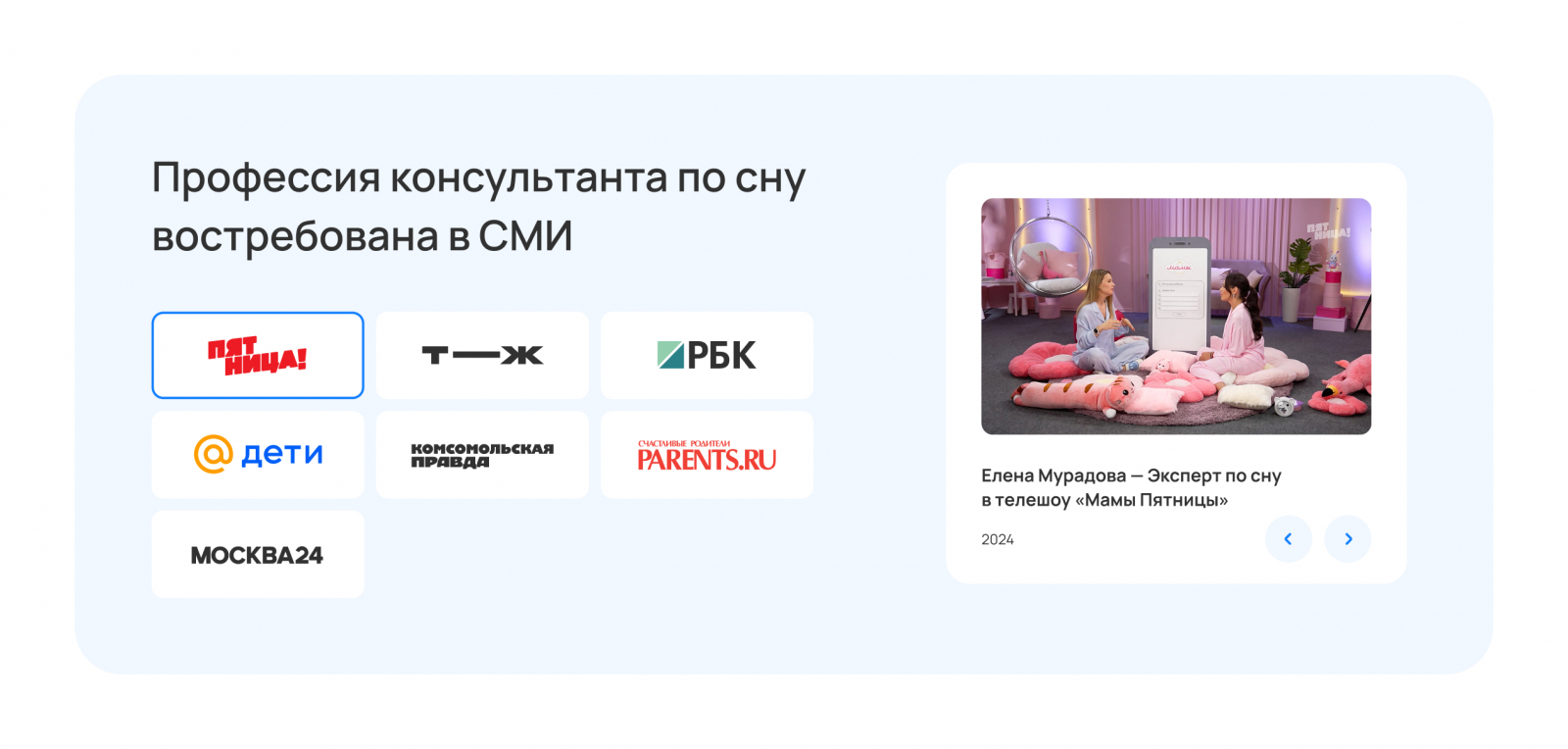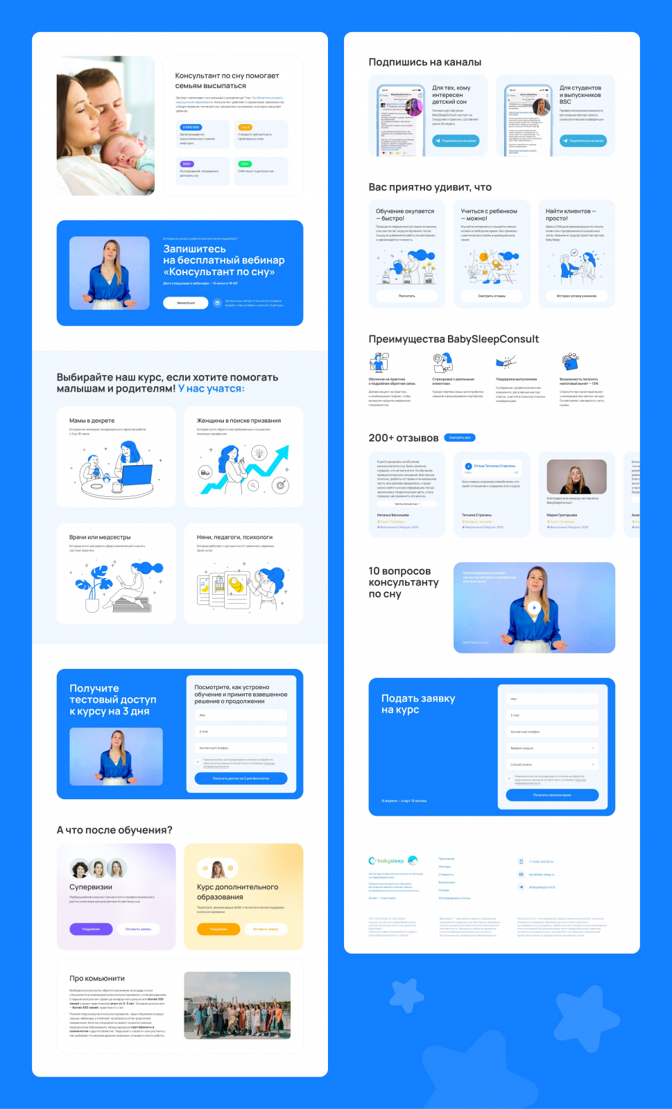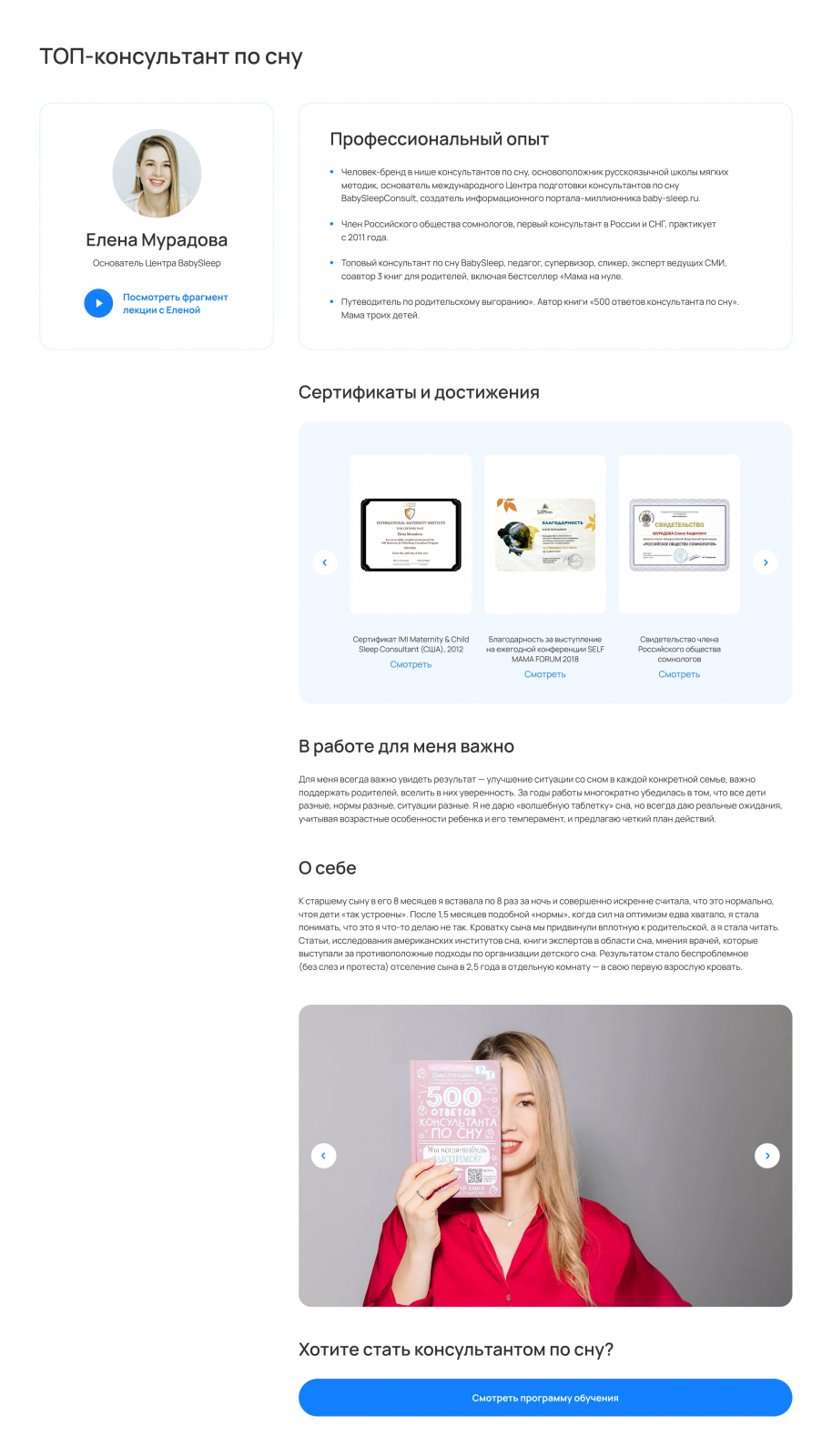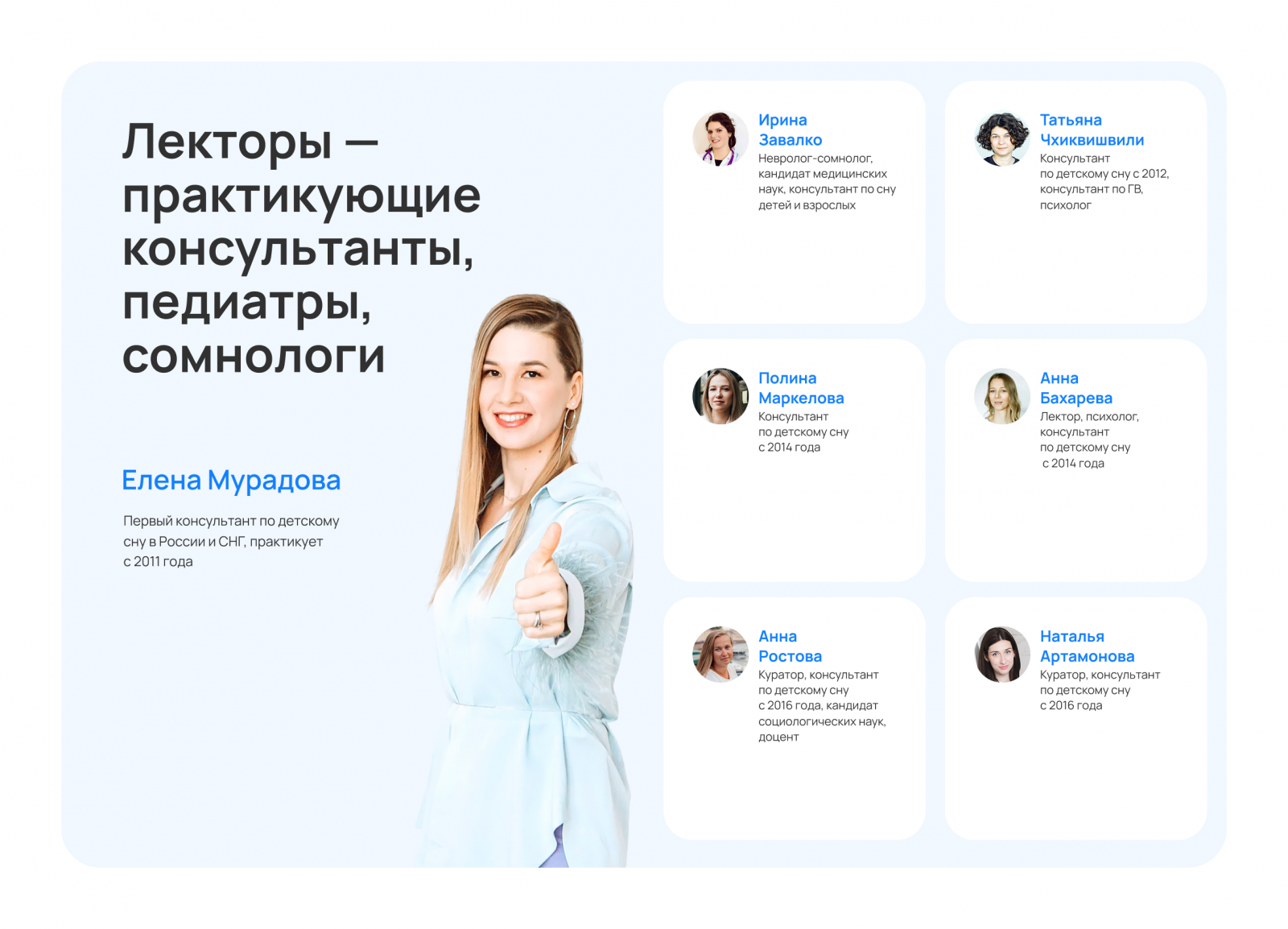 Ниша детского сна напрямую связана со здоровьем. У аудитории (мам) высокий порог тревожности и скепсиса. Чтобы снять возражение «А кто меня будет учить?», мы спроектировали детальные профили преподавателей.