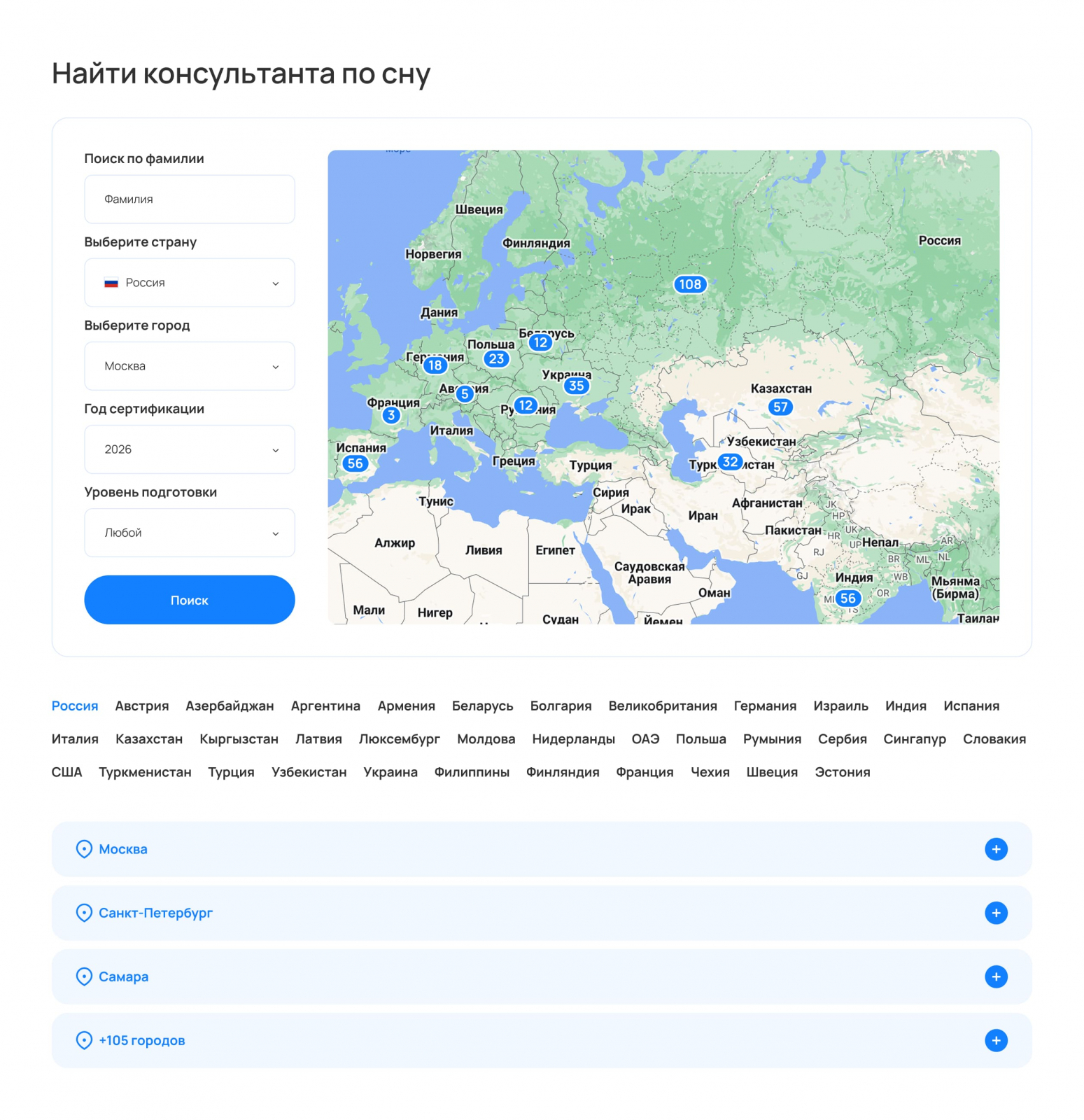 Как доказать, что вы — международная школа? Сказать «у нас учатся во всем мире» — недостаточно. Мы разработали интерактивную карту в реестре выпускников. 800+ дипломированных специалистов из 39 стран (от Аргентины до Японии). По клику открывается выборка по стране и городу. Это мгновенно продает масштаб школы и работает на SEO.
