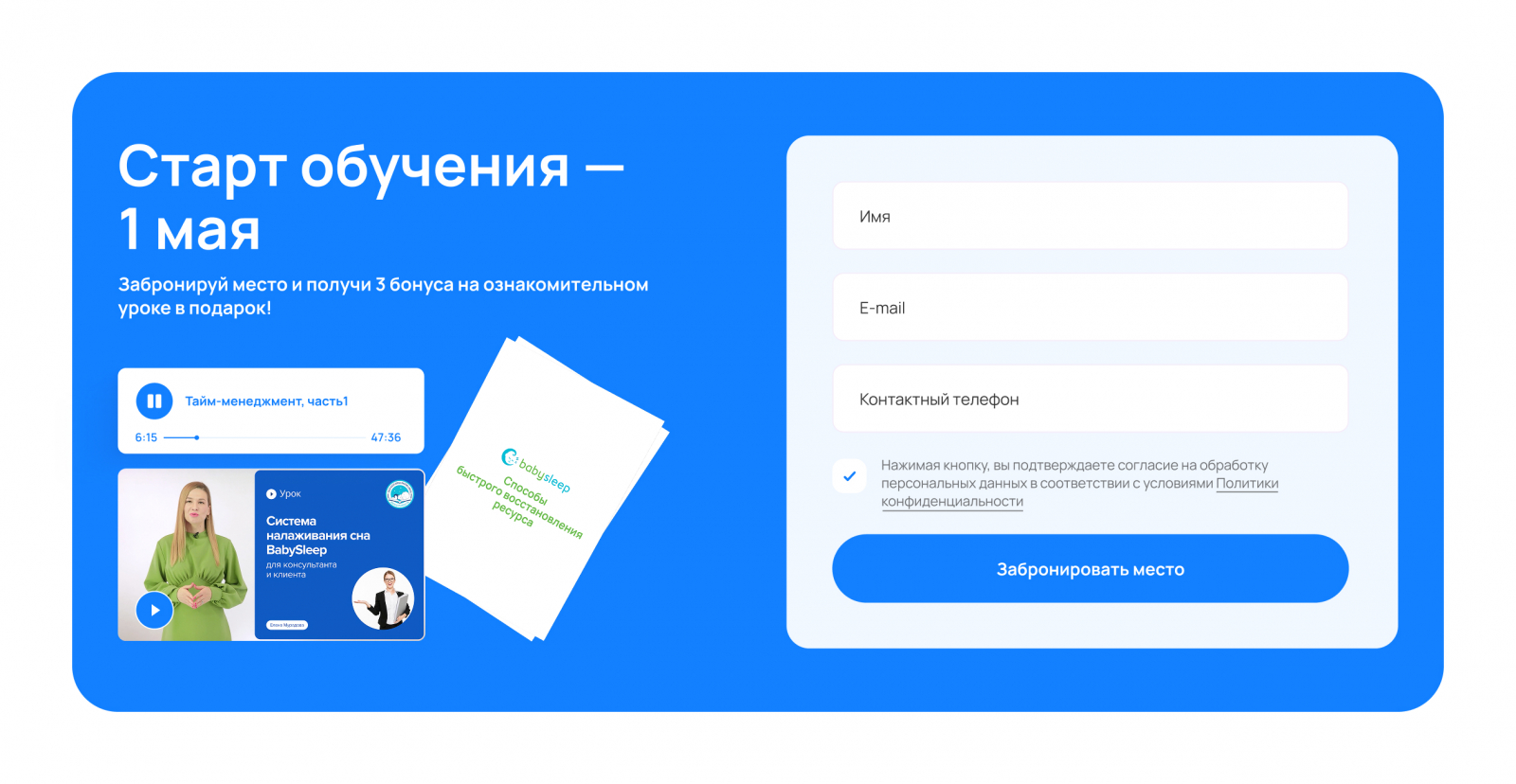 Клиент переживал: «Как показать, что у нас крутые материалы — и видео, и конспекты, и аудио?» Наше решение: не писать об этом, а дать “потрогать” прямо на лендинге. Мы вынесли плееры, PDF-файлы и фрагменты видео на главный экран. Человек может сразу скачать конспект или послушать демо-урок. Это закрыло все возражения еще до этапа оплаты.