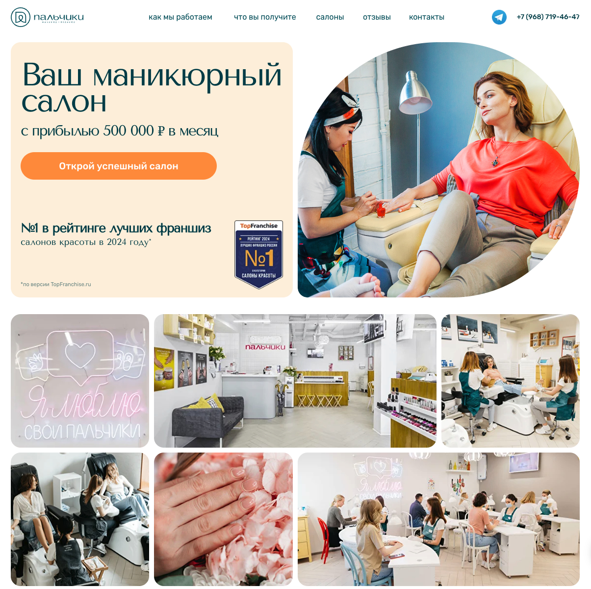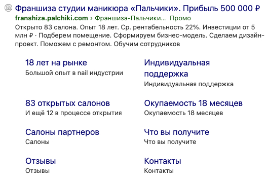 4. Создал релевантные объявления. Собрал минус-слова из старых кампаний + расширил список из wordstat. Сделал новые текстово-графические объявления с фото реальных салонов. В креативах добавил понятные короткие офферы: «Франшиза маникюрного салона «Пальчики»», «80+ открытых салонов, прибыль N рублей, рентабельность N%, инвестиции от N млн рублей» и др.