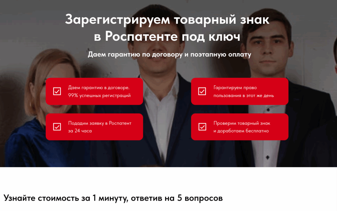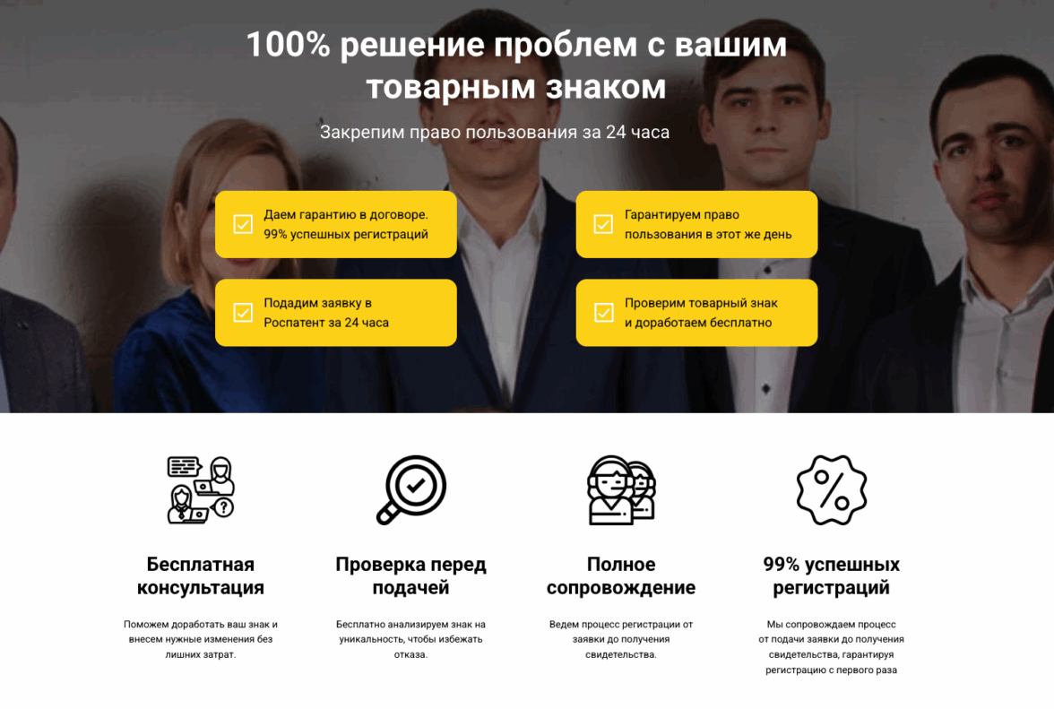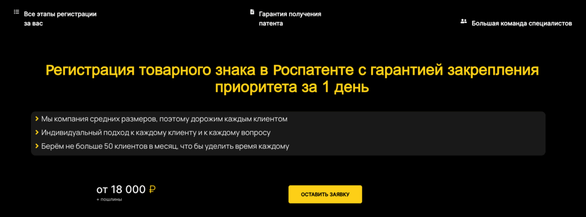 У клиента был типичный лендинг для юридических услуг: гарантия регистрации, таблица с ценами на разные типы знаков, блок с этапами работы, отзывы, форма заявки. Профессиональный, но абсолютно непримечательный — из десятков похожих.