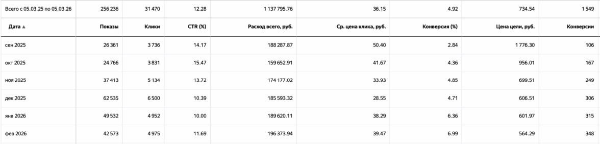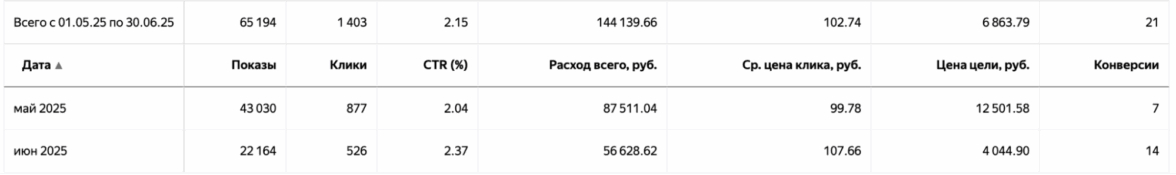 При среднем чеке 30–40 тысяч рублей это была работа в минус. Но главный вывод уже был виден: проблема не в рекламе, а в посадочной странице.