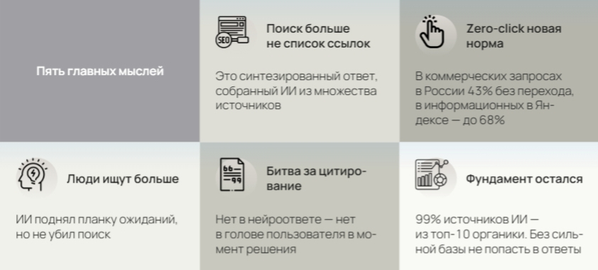 Раньше спрашивали: «На каком месте наш сайт?». Теперь: «Удобен ли наш бренд для рекомендации ИИ?». Битва идет не за клик, а за упоминание в ответе. Когда пользователь видит выжимку от Яндекса или Google, в ней цитаты из 3-4 источников. Если вас там нет - вас не существует для этого пользователя в этот момент. А момент этот - точка принятия решения.