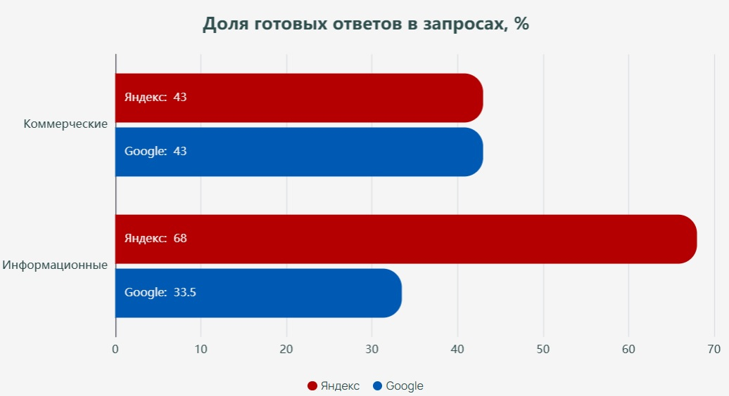 По правде говоря российский рынок всегда жил своей жизнью. То, что работало в глобальном Google, могло не работать в Яндексе, и наоборот.Ситуация обострилась. Яндекс с его YATI 3.0 и YandexGPT 4.0 ушел прилично вперед в генеративных технологиях. Данные исследований говорят сами за себя: в информационных запросах доля нейроответов в Яндексе достигла 68%, тогда как в Google — только 33,5%. Если вы ведете блог или создаете образовательный контент, Яндекс в двух случаях из трех закроет вопрос пользователя прямо в выдаче, не отправляя его к вам. Он сделает это, даже если вы в топе: нейроответ формируется не по позиции сайта, а по авторитетности источника. Формальные SEO-приемы (накрутка ссылок, вхождения ключей, SEO-портянки) в 2026 году не просто бесполезны - они опасны. Алгоритмы Яндекса и Google ввели жесткие санкции за слабый контент. Последние обновления нацелены именно на отсев поверхностных материалов и продвижение тех, что несут реальную экспертность.