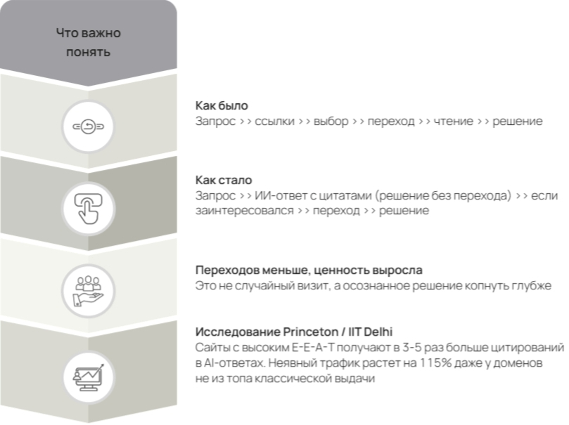 Исследования подтверждают: даже без клика сайт получает узнаваемость, влияние и устойчивый рост косвенного трафика. А когда пользователь все-таки переходит по ссылке из нейроответа, конверсия такого визита в 2-3 раза выше, чем у обычного органического трафика. Потому что это уже не случайный прохожий, а человек, который получил предварительную информацию и пришел за конкретным решением