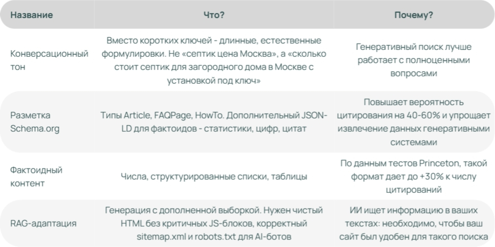 Представьте, что вы продаете септики. Раньше вы написали бы статью «Все о септиках для загородного дома» на 10 тысяч знаков, равномерно распределив ключи. Сегодня вам нужно создать страницу, где в первых двух абзацах будет прямой ответ: «Септик для дома с постоянным проживанием должен иметь объем не менее 3 кубов, материал - бетон или стеклопластик, а тип очистки - био или аэробный. Дальше расскажем подробнее о каждом параметре».