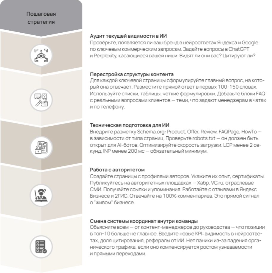 Переход от SEO к AEO и GEO звучит сложно, но на самом деле это последовательность конкретных действий.