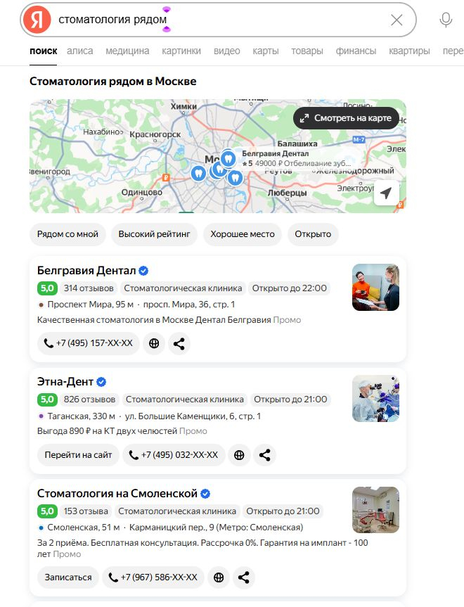Пациент редко поедет через весь город ради обычного приема. Поэтому Яндекс показывает ближайшие клиники. И именно здесь работает локальное продвижение клиники.