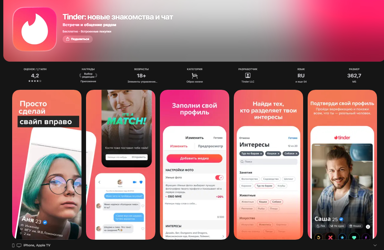 Возможности: поиск по локации; фильтры; сообщения/матчи (по доступу).