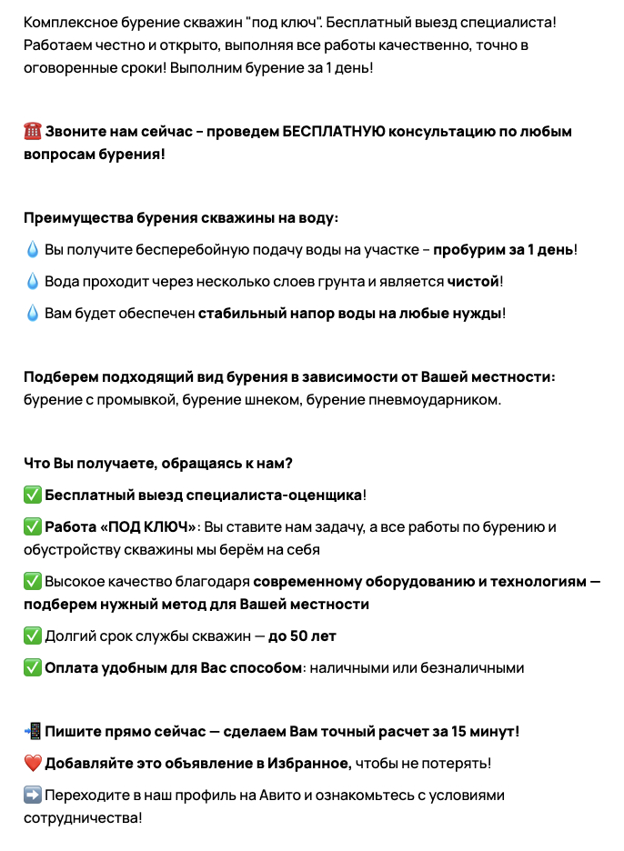 Что делать, если вы загрузили объявления на Авито, но клиенты заказывают стройматериалы у конкурентов? Мы проведем полный аудит аккаунта и составим оптимальную стратегию под ваш бюджет. Изучим специфику товара, его востребованность в регионе. Вы получите реальных клиентов на бурение скважин, а не просто заявки и клики по объявлению.