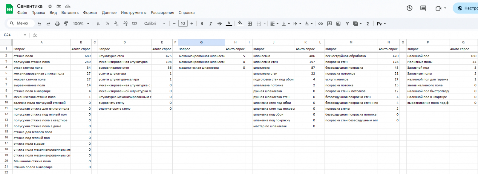 На услугу полусухой стяжки спрос выше. Мы проанализировали и выбрали пул городов, где самый высокий спрос (города Тульской и Калужской области). Разместили в аккаунте 60 объявлений по всем этим направлениям.