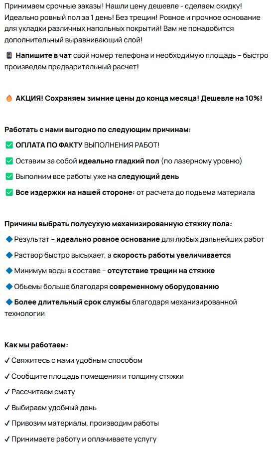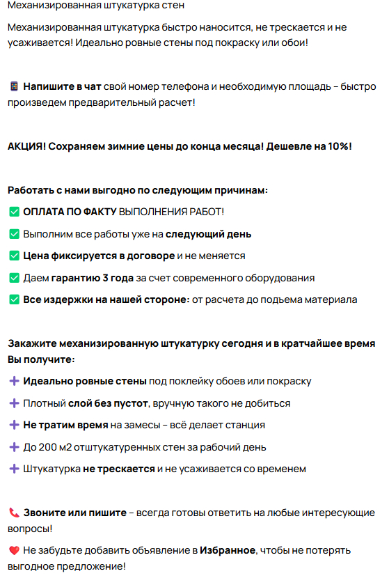 Мы учитывали тот факт, что людям важно сразу же сделать расчет стоимости. И еще одно сильное преимущество: скорость работы. За счет того, что механизированная штукатурка и стяжка пола делаются гораздо быстрее, чем ручная. Это значительная экономия времени. И другие отделочные работы не будут простаивать. Кроме того, это дешевле, потому что бригада приезжает, за один день все выравнивает, потом все сохнет, потом приезжает повторно. Все это мы указывали в креативах, текстах.