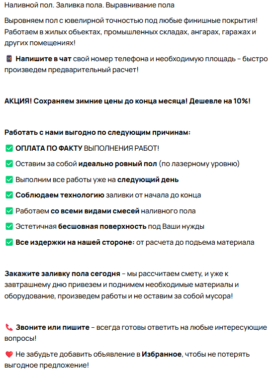Сделать несколько разных креативов, хотя бы 3, а лучше 5 на каждую услугу. Важно, чтобы они были разные. Это могут быть как объявления с инфографикой, текстом, так и объявления с результатом работы. Допустим, просто пример выровненного пола или стен, фото с мастером или представителем компании. Плюсом к этому нужно прописать текст.