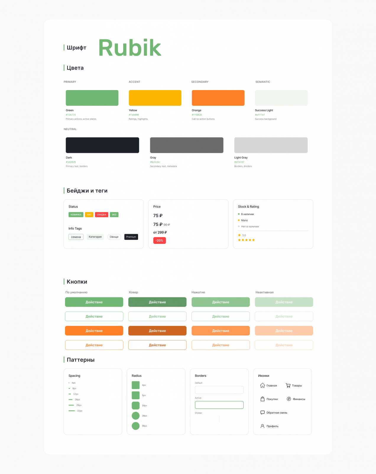 В качестве шрифта использовали Rubik — современный гротеск, хорошо адаптированный для веб-интерфейсов. Он легко читается, выглядит актуально и за счёт широкой линейки начертаний даёт достаточно возможностей для работы с визуальной иерархией текста.
