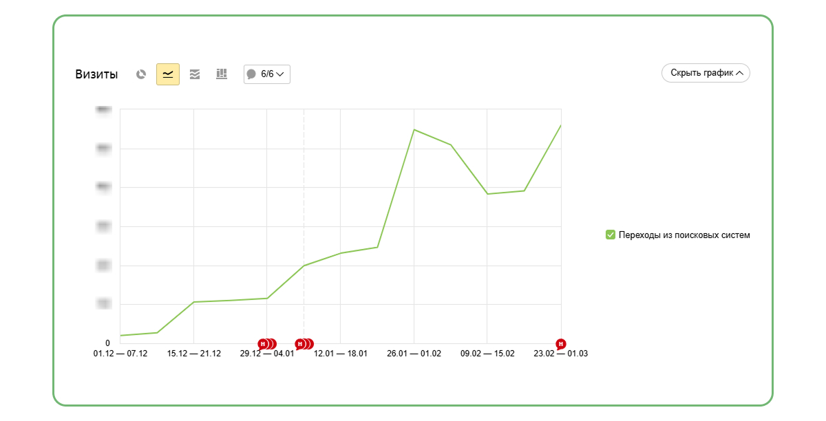 Релиз сайта состоялся в декабре 2025 года. Уже на старте проект показал хорошие поведенческие и поисковые показатели: растёт трафик, сохраняется достойная глубина просмотра и низкий уровень отказов. Такой результат удалось получить без дополнительной SEO-оптимизации — за счёт базовой подготовки к релизу и тщательной проработки структуры и пользовательской логики на этапе разработки.