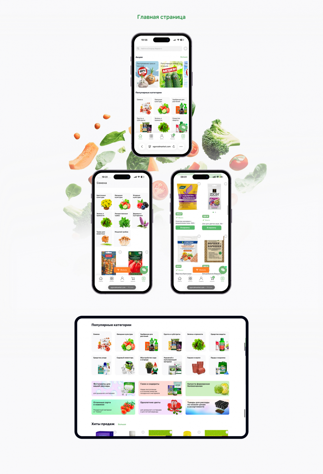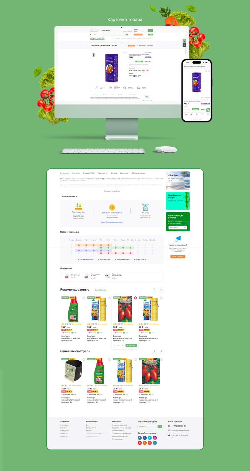 Отдельное внимание клиент уделил визуальному наполнению сайта. Фотографии и иллюстрации он создаёт самостоятельно, благодаря чему контент интернет-магазина «Огород Маркет» получился уникальным, узнаваемым и визуально привлекательным.