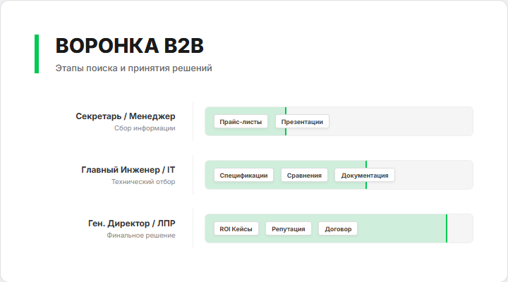 В B2B решение редко принимает один человек. Обычно это группа из 3–6 специалистов, и у каждого - свой интент (намерение) в поиске. Профессиональное digital агентство всегда проектирует стратегию продвижения, ориентируясь на роли этих людей, создавая контентные воронки для каждого участника процесса.