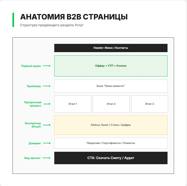 Посадочная страница услуги в B2B - это, по сути, ваше коммерческое предложение, выложенное в открытый доступ. Она должна закрывать все возражения клиента до звонка менеджеру. Если страница слабая, клиент уйдет к конкуренту, у которого «все понятно», даже если ваш продукт объективно лучше.